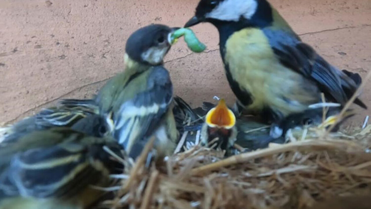 'Büyük baştankara' kuşunun saksıdaki yavrularını beslediği anlar kamerada