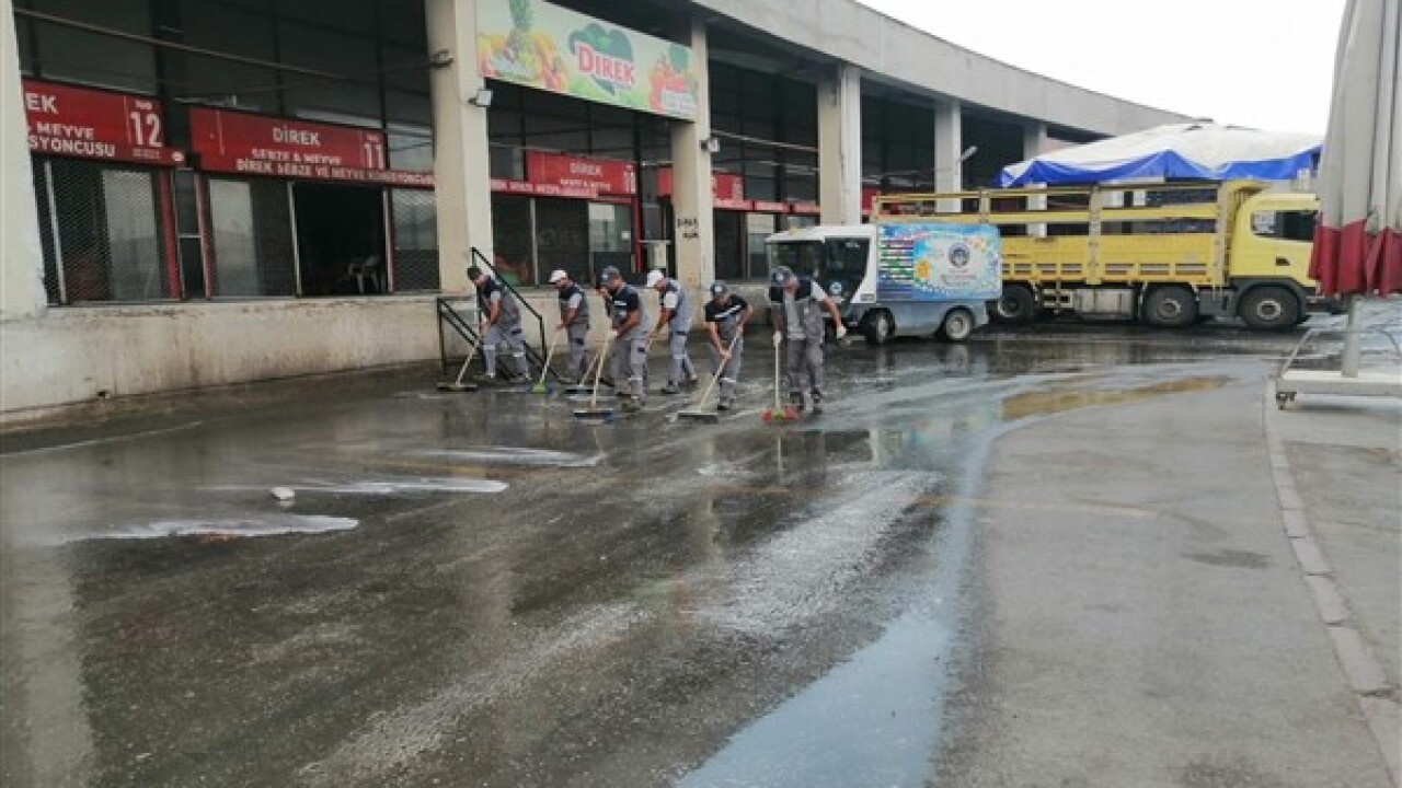 Kayseri Büyükşehir Belediyesi ekipleri, karpuz, kavun, üzüm gibi şıralı meyvelerden oluşan zor ve inatçı kirlerin giderilmesi noktasında hal esnafına destek olarak önce genel temizlik, ardından da köpüklü su ile yıkama çalışması yaptı.
