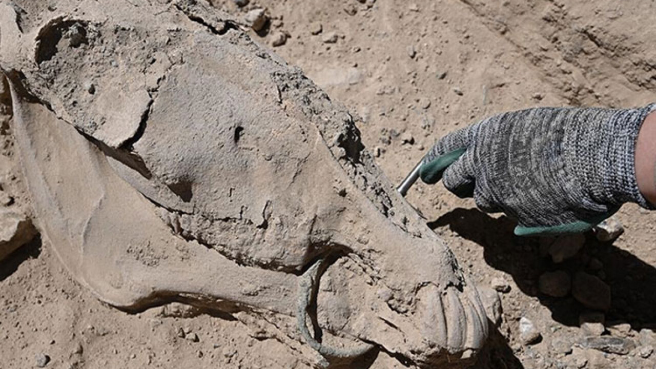 Van'da Urartular döneminde inşa edilen Çavuştepe Kalesi'nin kuzeyindeki nekropol alanında çenesinde bronz gem olan at iskeleti ortaya çıkarıldı.