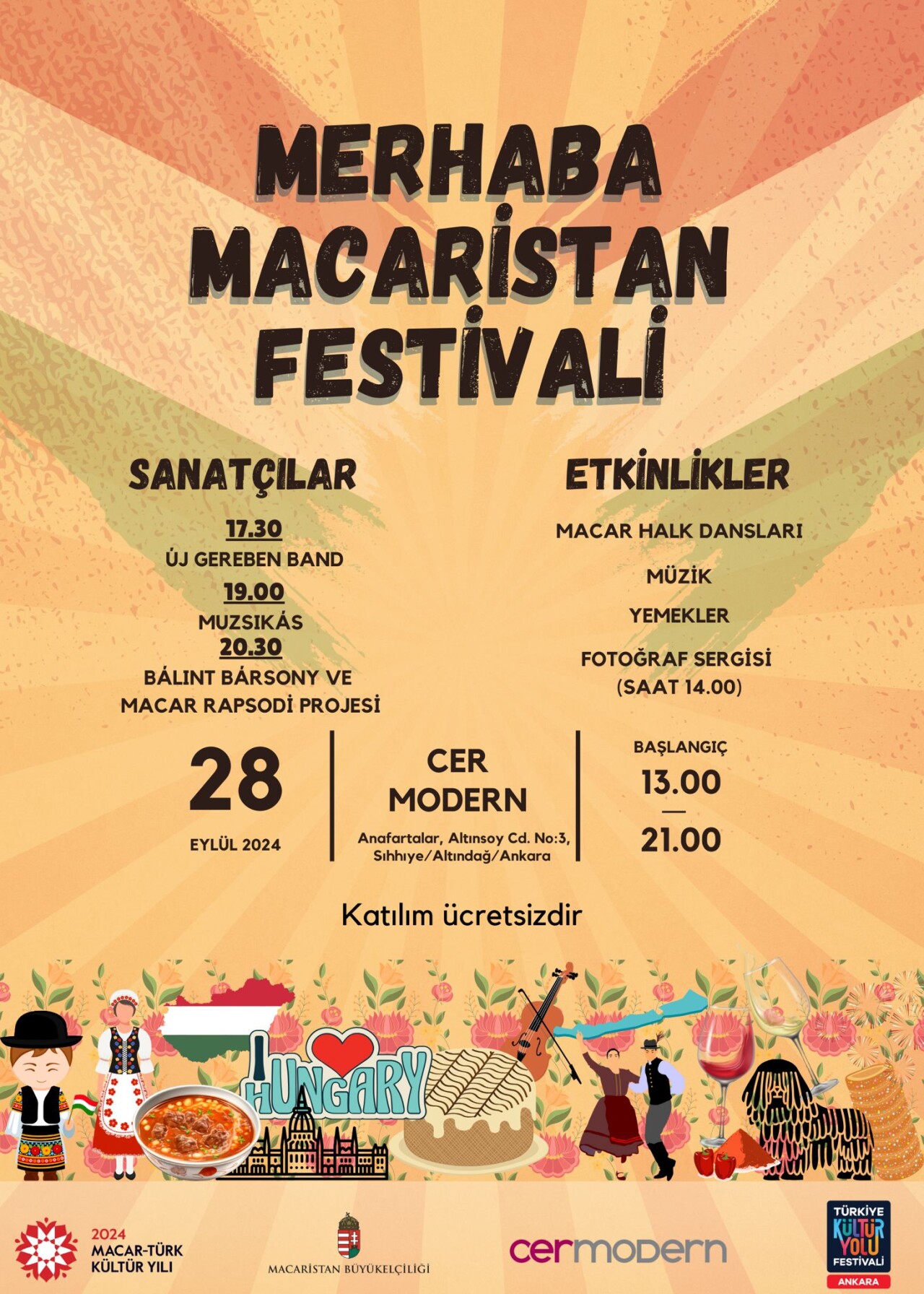 İlgi duyanlar Cumartesi günü saat 13.00'ten itibaren Macar halk müziği, dansı ve yemekleriyle tanışabilirler. Çocukları boncuk işi, dans ve kaligrafi beklerken, katılımcılar aynı zamanda Macaristan'ın Sárköz Bölgesinin geleneklerini de öğrenebilecekler.