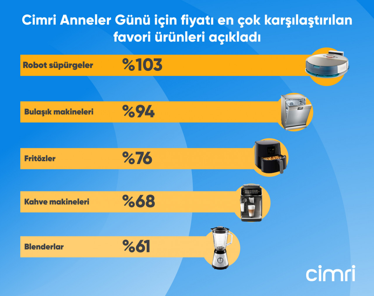 Cimri verileri incelendiğinde, Anneler Günü öncesinde daha çok beyaz eşya ve küçük ev ürünlerinin özelliklerinin ve fiyatlarının karşılaştırılması da dikkat çekti.