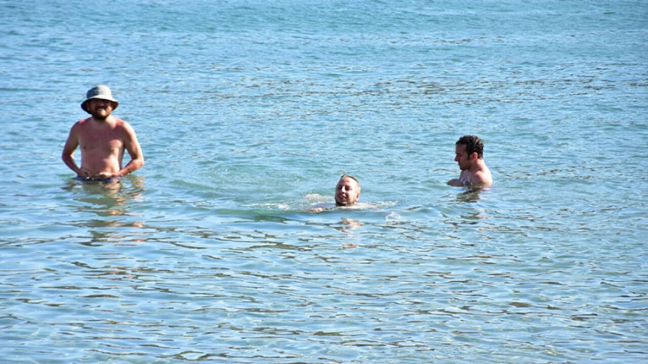 Sezonun yorgunluğunu denize girerek atan yakın arkadaşlar yaklaşık bir saat suda kaldı. Yüzme bilmeyen Hamza Yazıcı'ya rol arkadaşları Cem İşçiler ve Cihan Talay yüzme dersi verirken aralarındaki renkli görüntüler objektiflere yansıdı. Öte yandan Cihan Talay'ın denize şapka ile girmesi dikkatlerden kaçmadı.