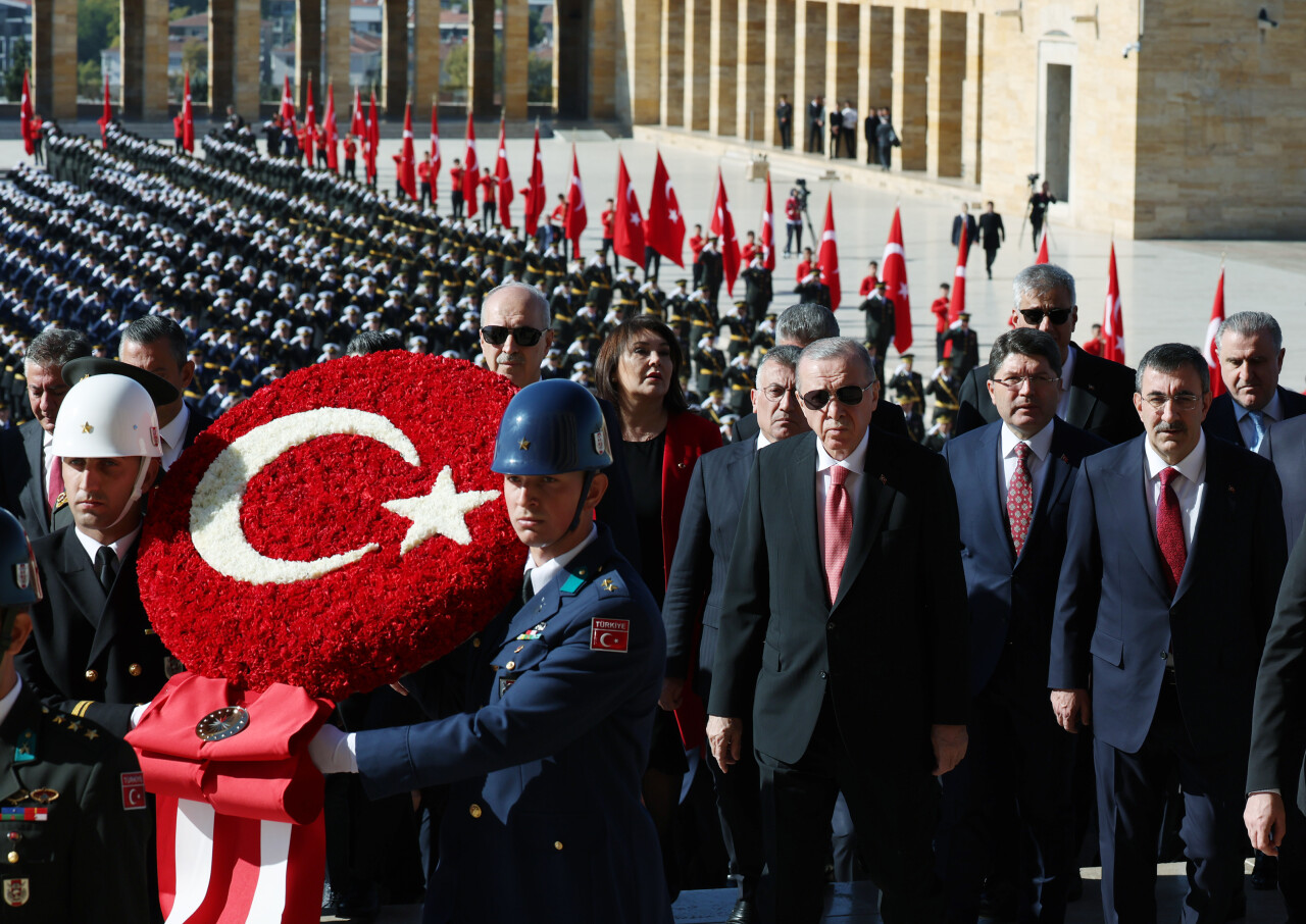 Cumhuriyet'in ilanının 101'inci yıl dönümü kutlamaları kapsamında ilk tören, Anıtkabir'de düzenlendi. Tören, devlet erkanının Aslanlı Yol'da yürüyüşüyle başladı.