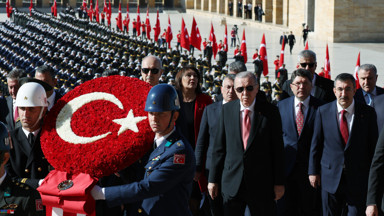 Cumhurbaşkanı Erdoğan'ın, üzerinde ay yıldız bulunan çelengi Atatürk'ün mozolesine bırakmasının ardından saygı duruşunda bulunuldu ve İstiklal Marşı okundu.