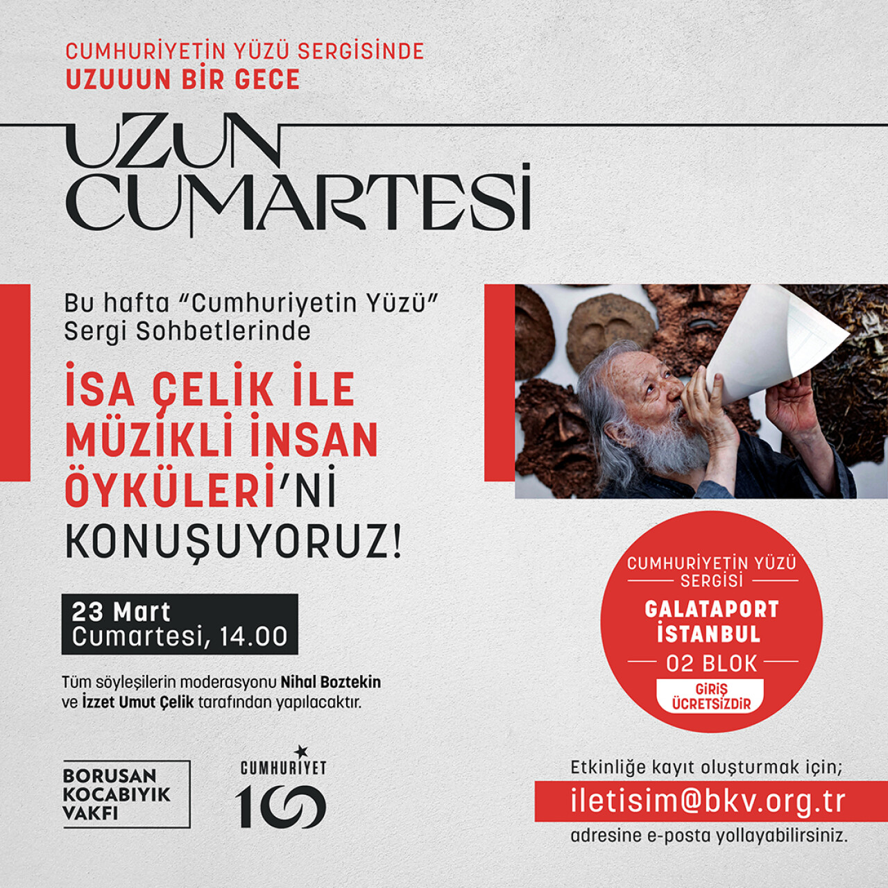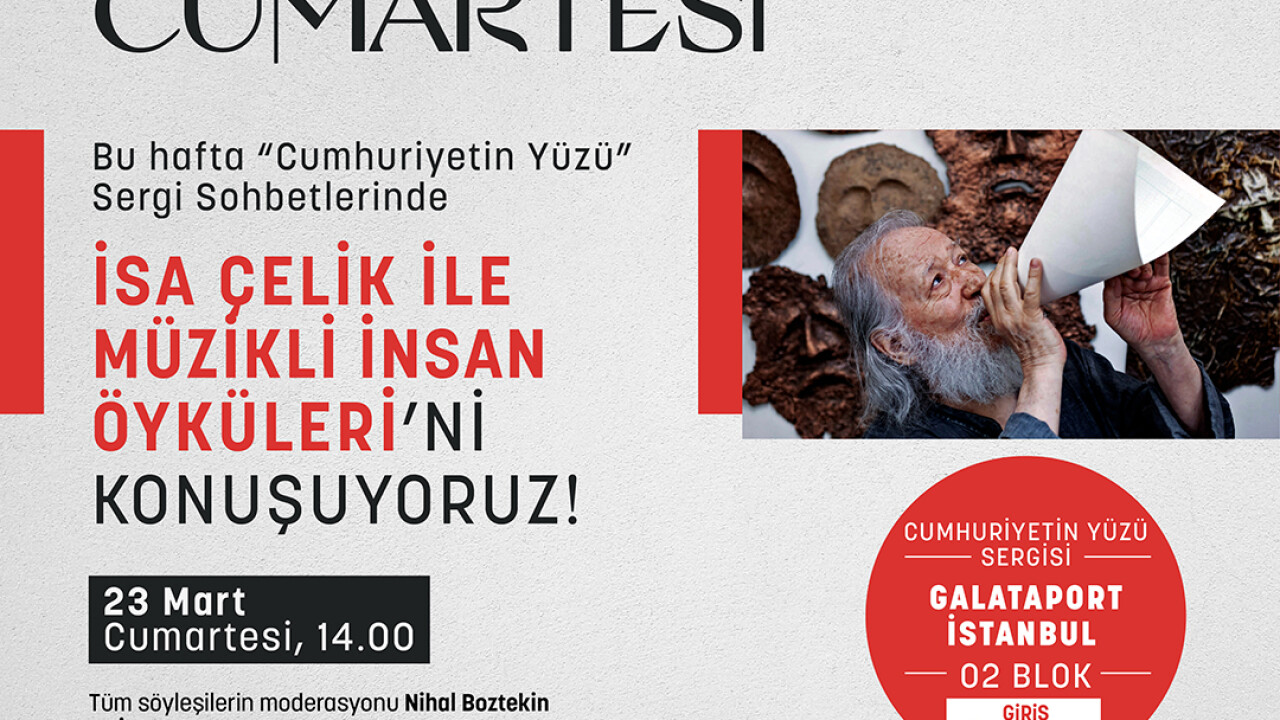 Uzun Cumartesilerde “Cumhuriyetin Yüzü Sergi Sohbetleri” adında bir etkinlik serisi başlıyor. İlki 23 Mart Cumartesi günü saat 14.00’te başlayacak Sergi Sohbetlerinin konuğu İsa Çelik olacak.