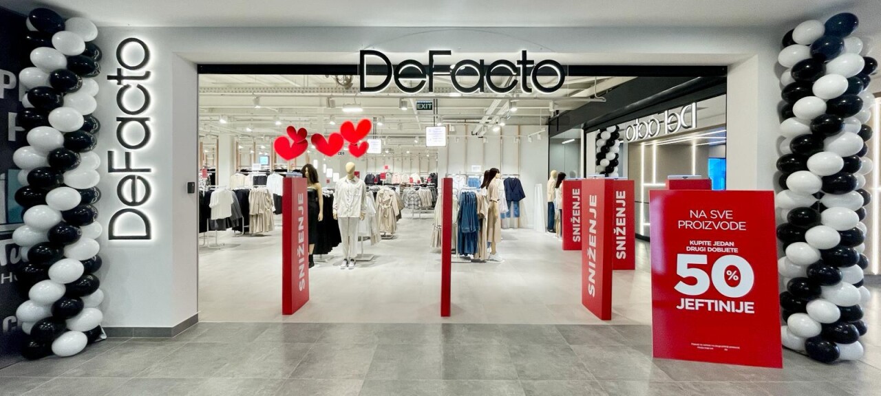 Yurt içi ve yurt dışı mağaza yatırımlarıyla büyümesini sürdüren DeFacto, Türk hazır giyim ve moda sektörünün uluslararası arenaya taşınmasına öncülük etmeye devam ediyor. Kurulduğu günden bu yana kaliteli ve uygun fiyatlı ürünlerini tüketicilerin beğenisine sunan DeFacto’nun Bosna Hersek’te açtığı 7’nci mağazası Tuzlanka AVM’de yer alıyor.