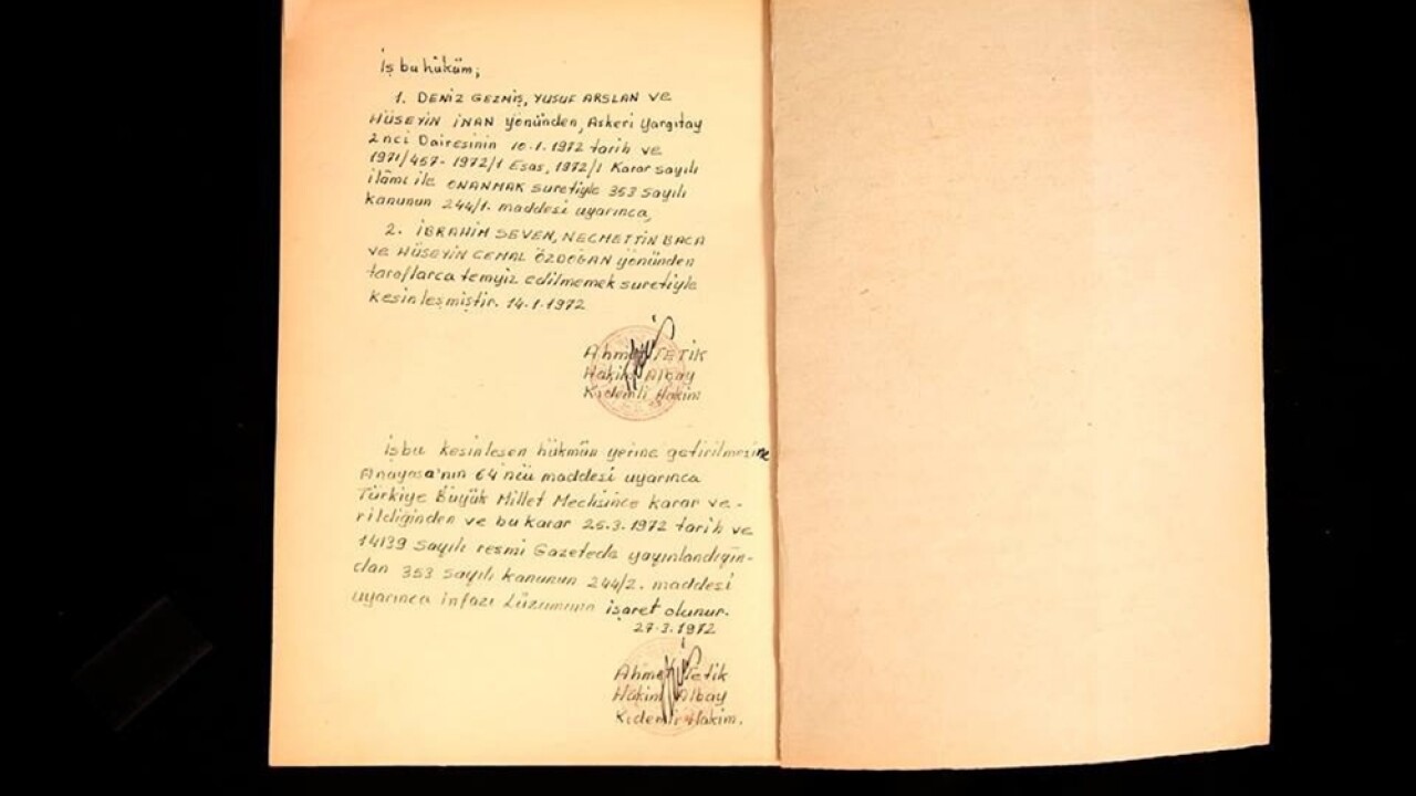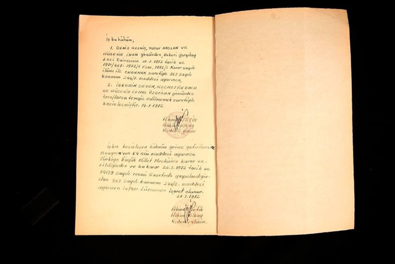 İstanbul’da bulunan bir müzayede şirketi, Deniz Gezmiş, Yusuf Aslan ve Hüseyin İnan’ın kesinleşmiş idam hükmünün ıslak imzalı orijinal evrakını açık artırmaya çıkardı.