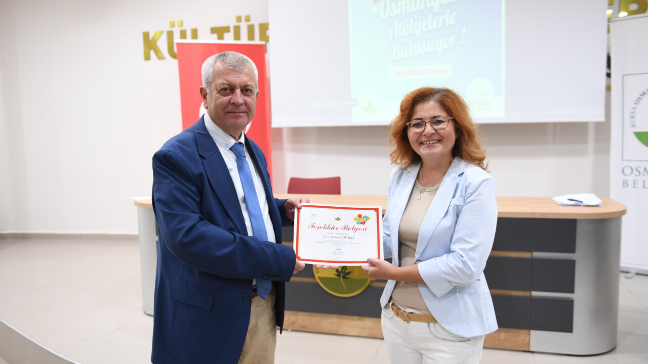 Eğitimleri başarıyla tamamlayan kursiyerler için Demirtaş Kültür Merkezi’nde sertifika töreni düzenlendi. Osmangazi Belediye Başkan Yardımcı Mutlu Esendemir ve Osmangazi Belediye Meclis Üyesi Sinan Nergiz, kursiyerlere sertifikalarını takdim ederek, başarılar diledi.