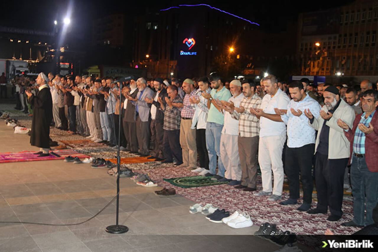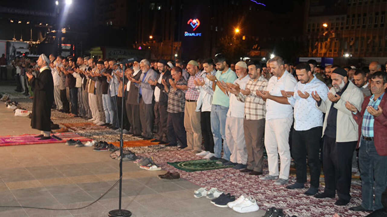 Diyarbakır'da Dağkapı Meydanı'nda bir araya gelen Peygamber Sevdalıları Vakfı üyeleri, sivil toplum kuruluşları ve vatandaşlar, yatsı namazının ardından Filistin'de hayatını kaybedenler için gıyabi cenaze namazı kıldı, dualar etti.