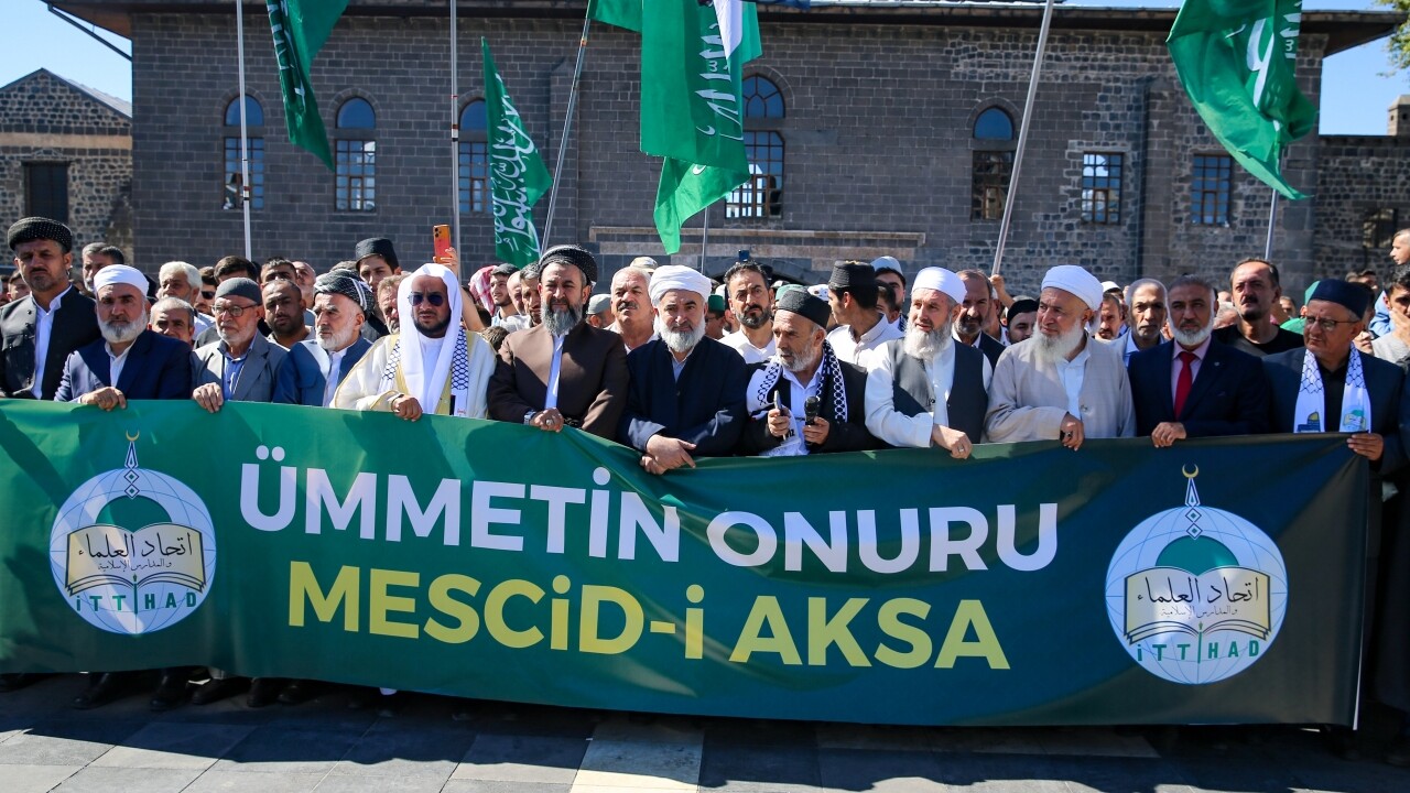 Merkez Sur ilçesindeki tarihi Ulu Cami önünde Alimler ve Medreseler Birliği (İTTİHAD) öncülüğünde toplanan grup, İsrail'in Gazze Şeridi'ne yönelik saldırılarını protesto etti.