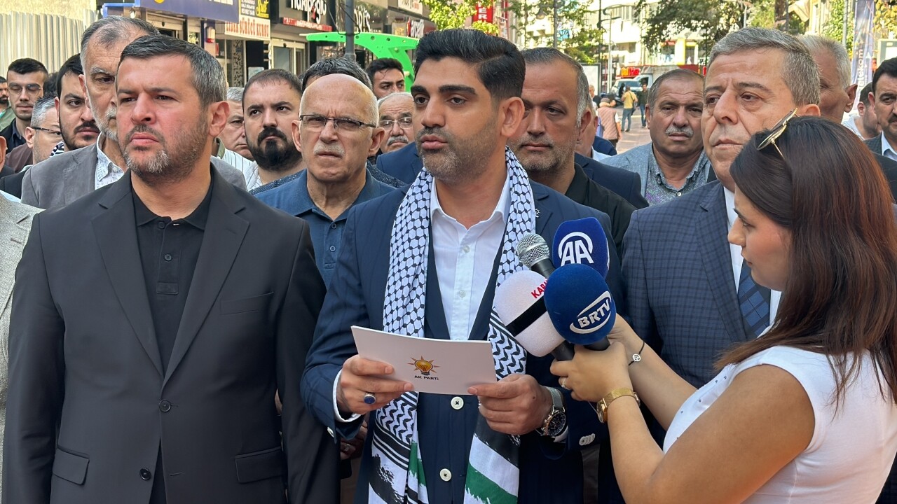 Kemal Güneş Caddesi'ndeki AK Parti İl Başkanlığı önünde toplanan belediye başkanları, AK Parti İl Başkanlığı teşkilatı üyeleri, sivil toplum kuruluşları temsilcileri ve vatandaşlar, İsrail'in 1 yıldır Gazze'ye havadan ve karadan düzenlediği saldırıları protesto etti.