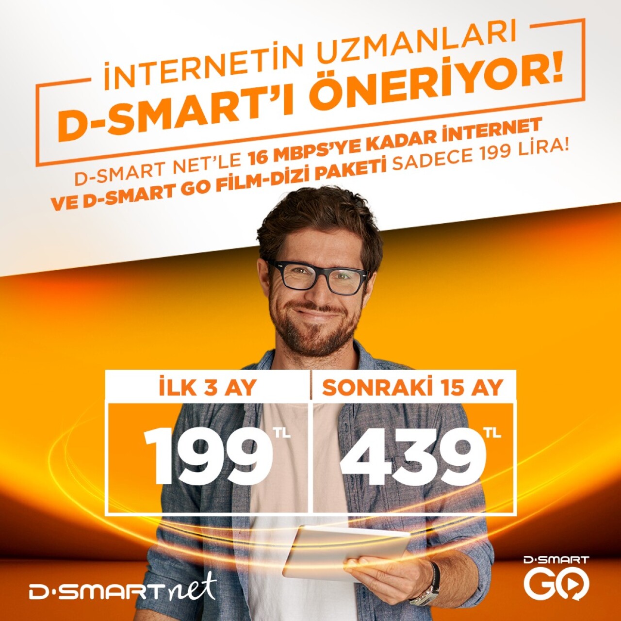 Rakiplerinden avantajlı fiyatlarıyla dikkatleri üzerine çeken D-Smart, yeni kampanyasını duyurdu. D-SMARTNET aboneleri; 16 Mbps’e kadar hızlı limitsiz internetle beraber, efsane film ve dizilerle dolu D-Smart GO film-dizi paketini ilk 3 ay 199 TL, sonraki 15 ay ise yalnızca 439 TL’ye kullanabilecek.