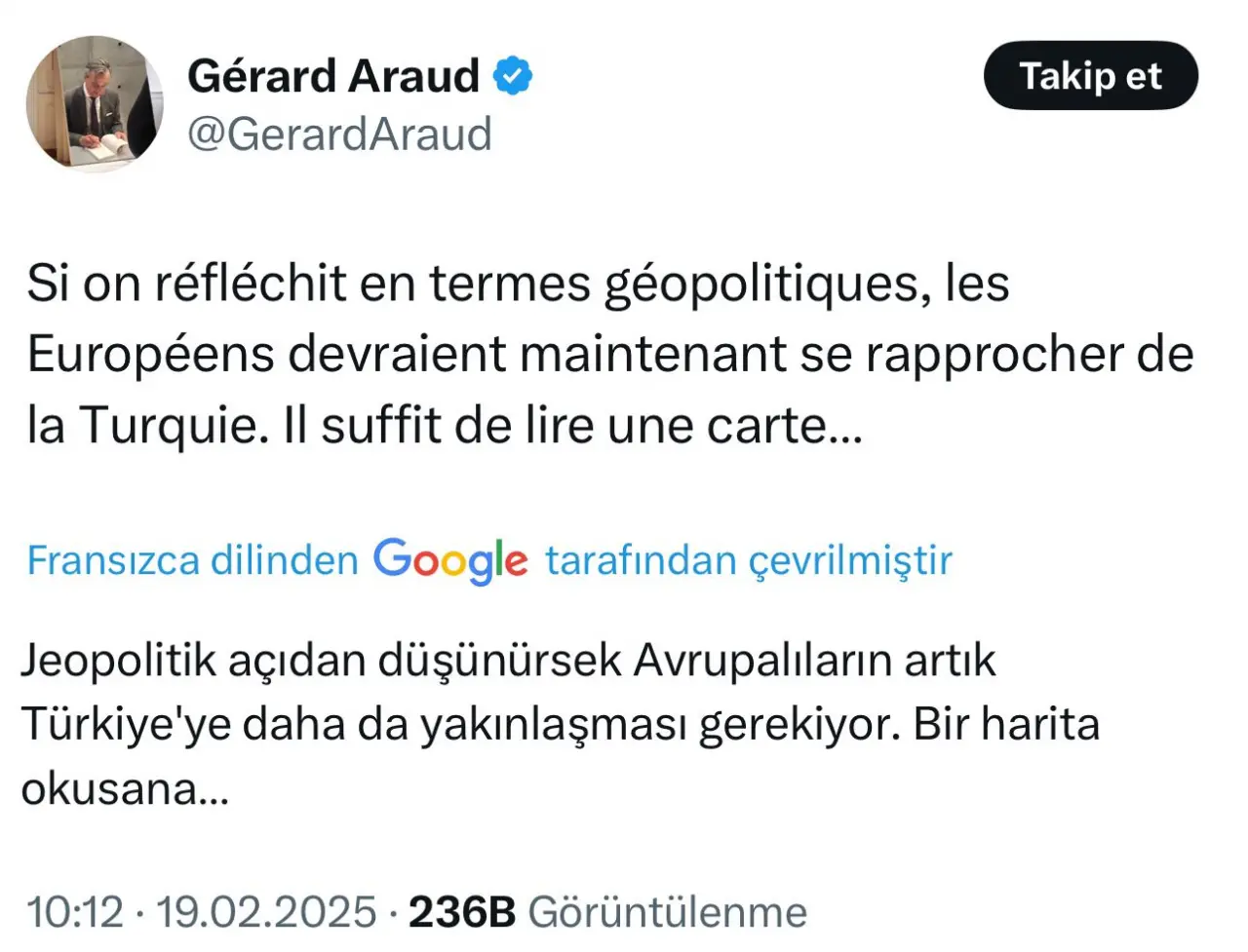 Fransa'nın ABD eski Büyükelçisi Gérard Araud da Türkiye'nin jeopolitik açıdan Avrupalılar için önemini vurgulayarak, Avrupalıların Türkiye'ye daha da yakınlaşması gerektiğini söyledi.