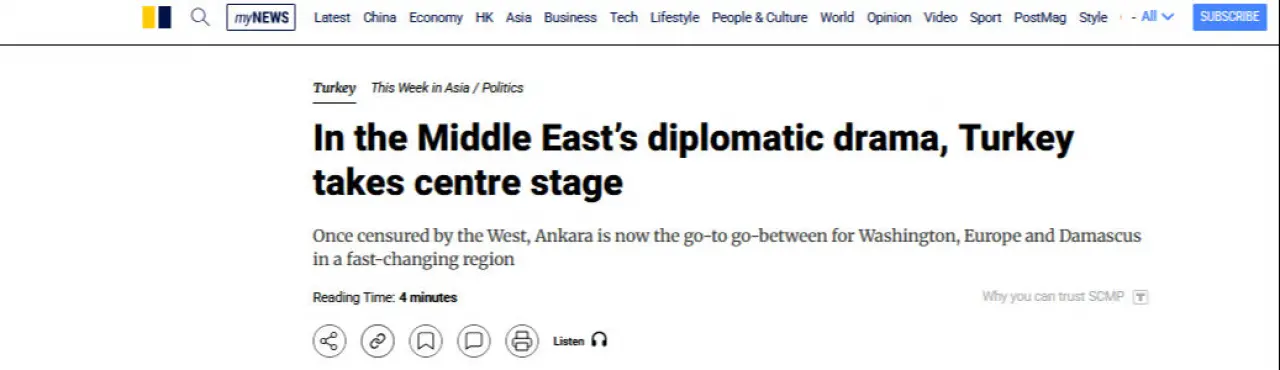 Hong Kong merkezli saygın yayın kuruluşu South China Morning Post (SCMP), Türkiye’nin 2025 yılında Orta Doğu diplomasisinin merkezine yerleştiğini yazdı. Haberde, “Bir zamanlar Batı'nın sert eleştirilerine hedef olan Ankara, artık Washington, Avrupa ve Şam arasında arabuluculuk yapan kilit bir ülke” ifadelerine yer verildi.