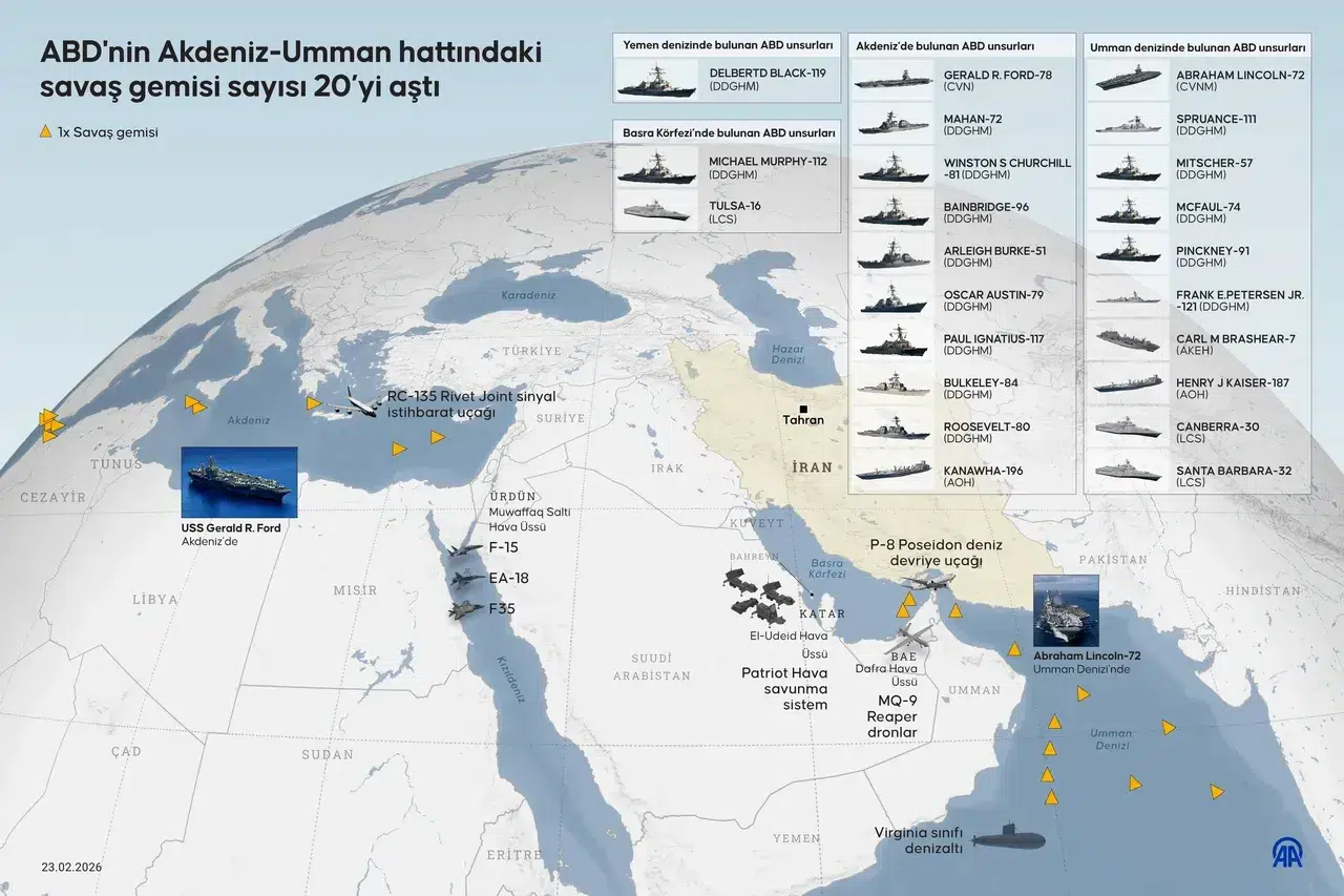 Uçuş takip verilerine göre ABD’nin, aralarında F-35, F-22, F-15 ve F-16 savaş uçaklarının da bulunduğu onlarca hava aracını Orta Doğu’ya gönderdiği bildirildi. Bu kapsamda bölgeye yönelik askeri sevkiyatın geniş çaplı olduğu aktarıldı.