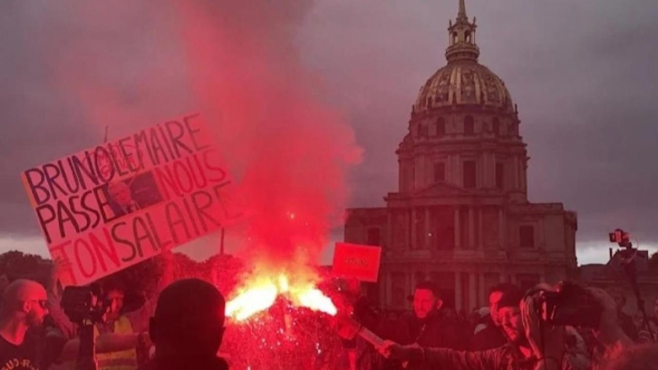Düzen karşıtı slogan atan göstericiler, ellerinde “Bir MAKaRON tarafından yönetilmek”, “Pastanın üstünde kriz”, “(Fransa Ekonomi Bakanı) Bruno Le Maire bize maaşını ver” yazılı pankartlar taşıdı.