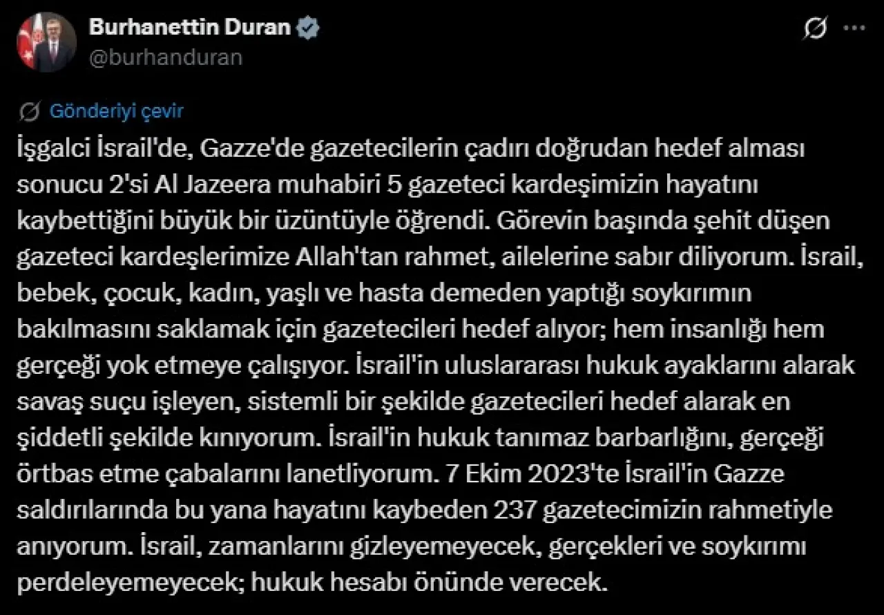 Duran, 7 Ekim 2023’ten bu yana İsrail saldırılarında 237 gazetecinin öldüğünü hatırlattı. Açıklamasında, “İsrail gerçekleri gizleyemeyecek, hukuk önünde hesap verecek” sözlerine yer verdi.