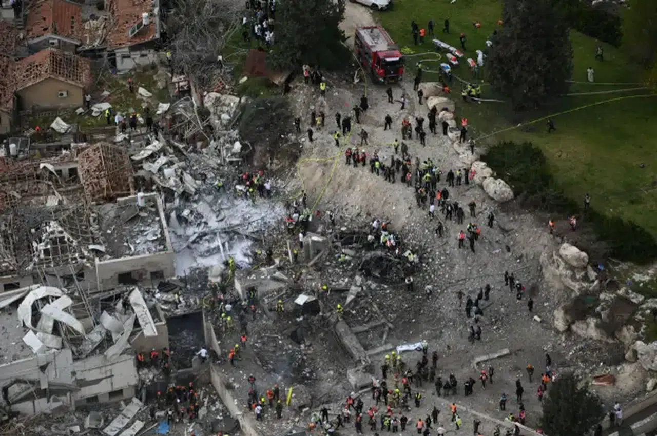 Füze isabetinin ardından Beyt Şemeş’te ciddi hasar oluştu. Çevredeki binalarda yıkımlar gözlemlenirken, ekipler enkaz altında kalan vatandaşları kurtarma çalışmalarını sürdürüyor.