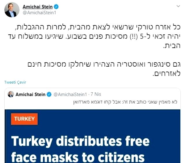 İsrailli gazeteci Amichai Setain, Twitter hesabından yaptığı paylaşımda Türkiye'nin koronavirüs tedbirlerini örnek göstererk, "Erdoğan'ı örnek almalıyız" dedi.