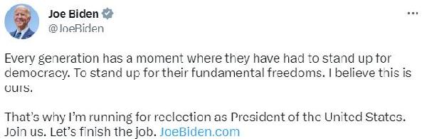 DHA- ABD Başkanı Joe Biden, sosyal medya hesabından 2024 yılında yapılacak seçimlerde yeniden aday olduğunu duyurdu.