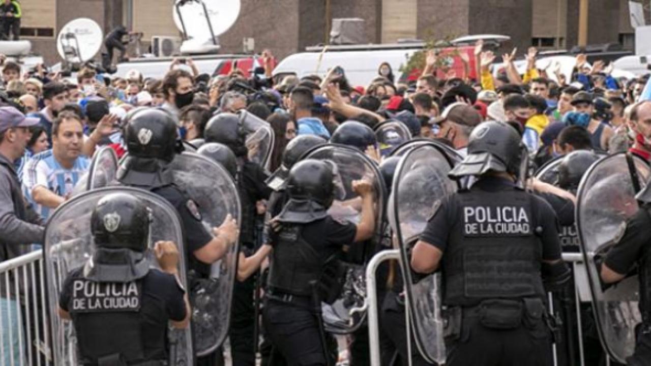Maradona'nın cenazesinin başkanlık binasına getirildiği esnada tabutunu görmek isteyen yüzlerce taraftar cenaze aracına yaklaşmak istedi ancak polis müdahalesiyle karşılaştılar