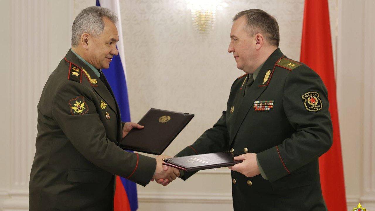 Belarus Savunma Bakanlığı'ndan yapılan açıklamada, "Belarus Savunma Bakanı Viktor Hrenin ve Rusya Savunma Bakanı Sergey Şoygu, Minsk'te ikili bir görüşme gerçekleştirdi. Askeri liderler askeri-politik durumu ve savunma bakanlıkları arasındaki askeri-teknik iş birliği konularını ele aldılar. Rusya'nın stratejik olmayan nükleer silahlarının Belarus Cumhuriyeti topraklarındaki özel bir depolama tesisinde tutulmasına ilişkin prosedürü tanımlayan belgeler imzalandı" denildi.