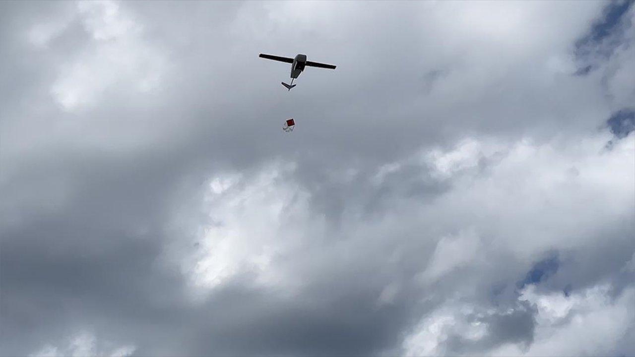 Paraşütlü kargosunu bırakan dron, havada süzülerek otomatik şekilde merkeze geri dönüş yolunu tespit ediyor.