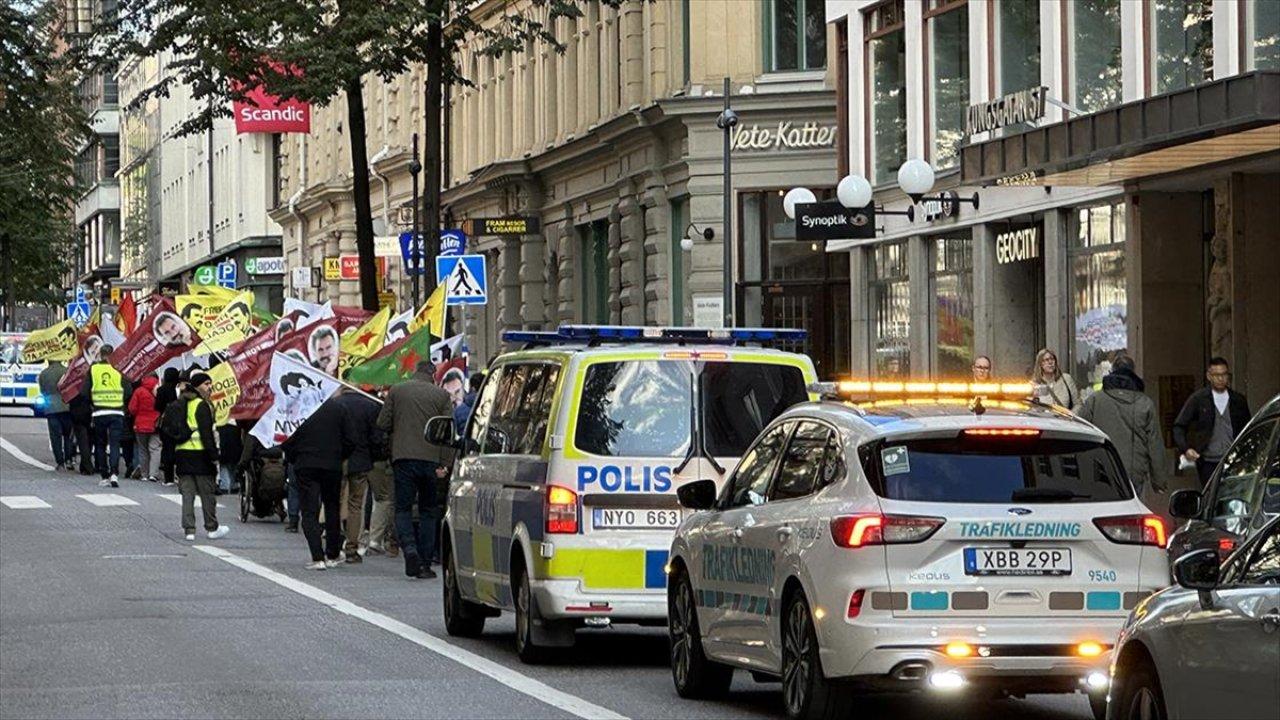 İsveç polisi, terör yandaşlarının yürüyüşlerini engelsiz tamamlamaları için önlem alarak güzergahtaki yolları kısa süreliğine trafiğe kapattı.