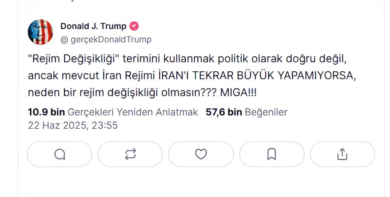 Trump, “Rejim değişikliği tabiri politik açıdan hassas olabilir, ancak mevcut İran yönetimi ülkeyi yeniden güçlü kılamıyorsa, neden bu rejim değişmesin?” ifadelerini kullanarak, kendi seçim sloganı olan “Make America Great Again” (MAGA) söylemini İran’a uyarlayarak “Make Iran Great Again” (MIGA) çağrısında bulundu.