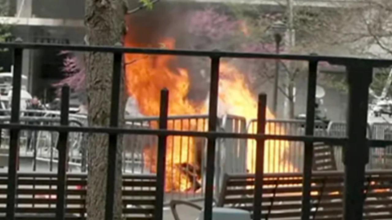 Trump'ın duruşmasının devam ettiği Manhattan'daki mahkeme binasının önünde televizyonlar canlı yayınlarına devam ederken bir kişinin kendini ateşe verdiği anlar ekrana yansıdı.