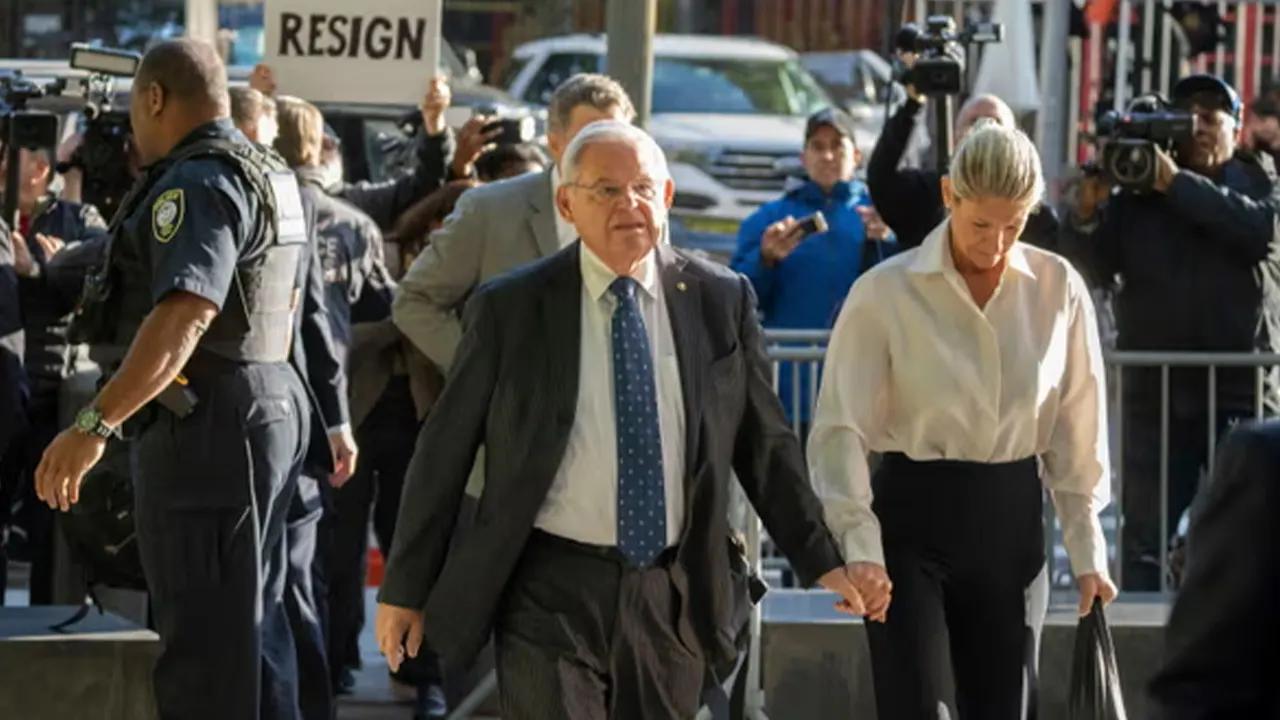 "Rüşvet almakla" suçlanan Menendez, eşi Nadine (Arslanian) Menendez ile geldiği Manhattan'daki mahkeme binası önünde gazeteciler ve "istifa et" sloganları atan bir grup protestocu tarafından karşılandı.