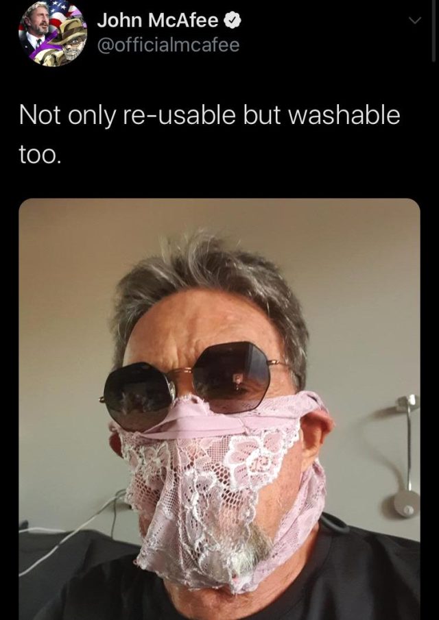 Ünlü iş insanı daha önce de sosyal medya hesabından kadın iç çamaşırından maske yapıp paylaşmıştı. McAfee, koronavirüse karşı maske takmayı protesto ediyor.