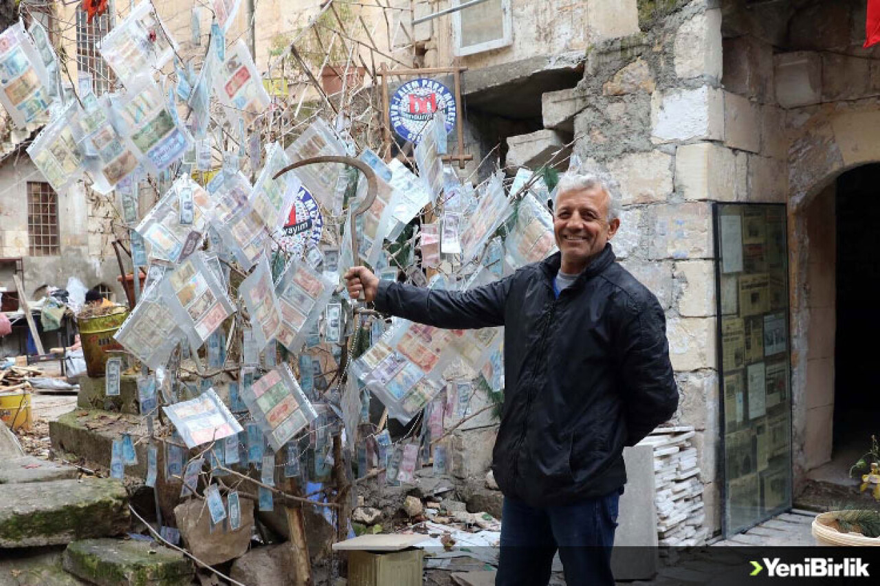 Gaziantep’te para müzesinin sahibi Esat Kaplan, çam ağacını 50 farklı milletin bugünkü karşılığı 3 trilyon olan tarihi paralarla süsledi. Kaplan, müzede elindeki orakla 24 saat nöbet tutuyor