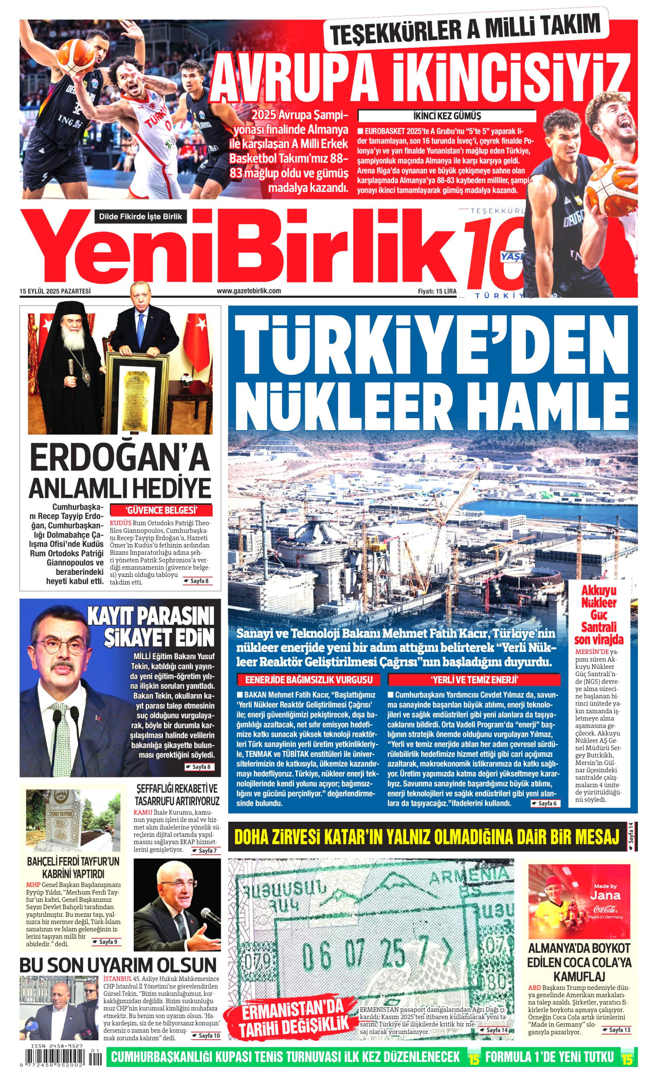 Yeni Birlik Gazetesi | 15 Eylül 2025