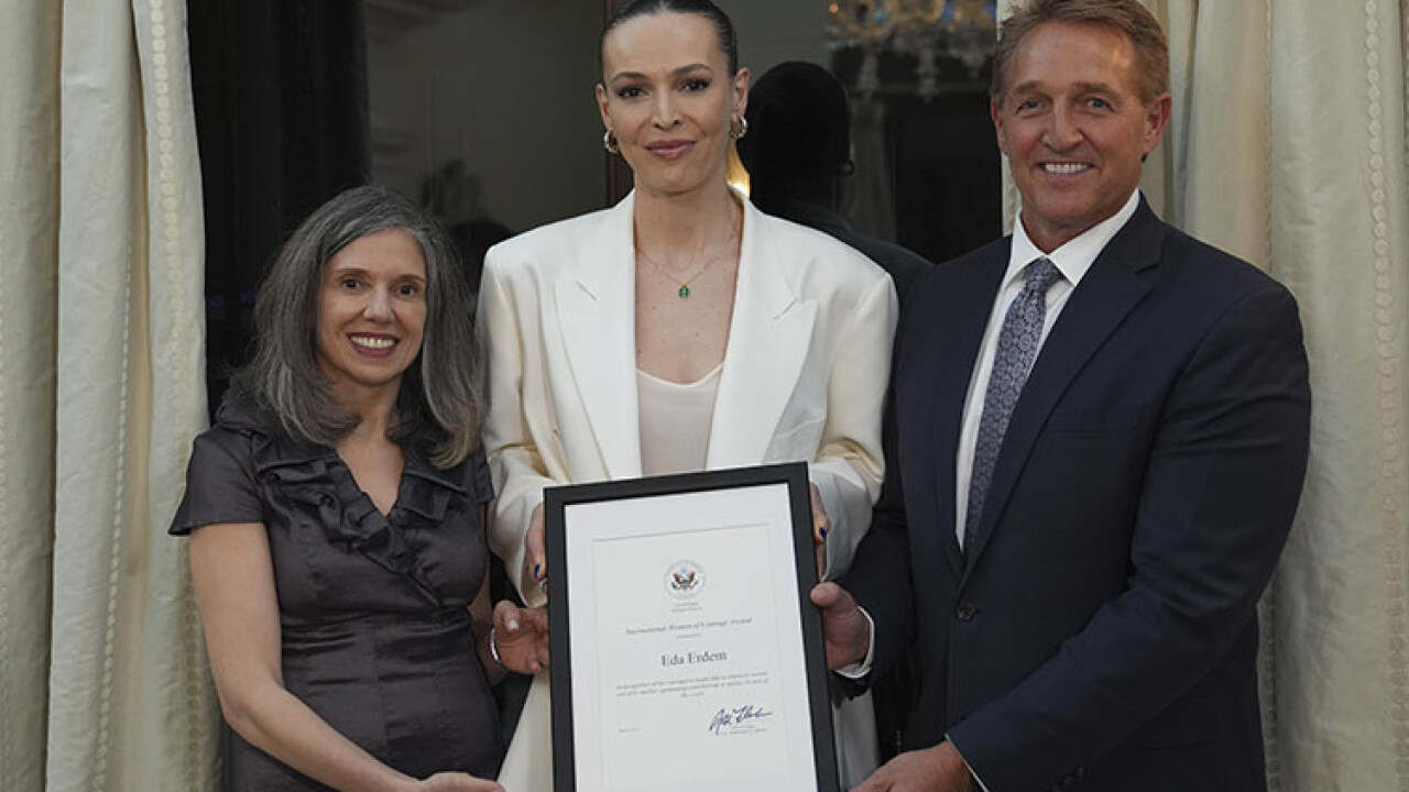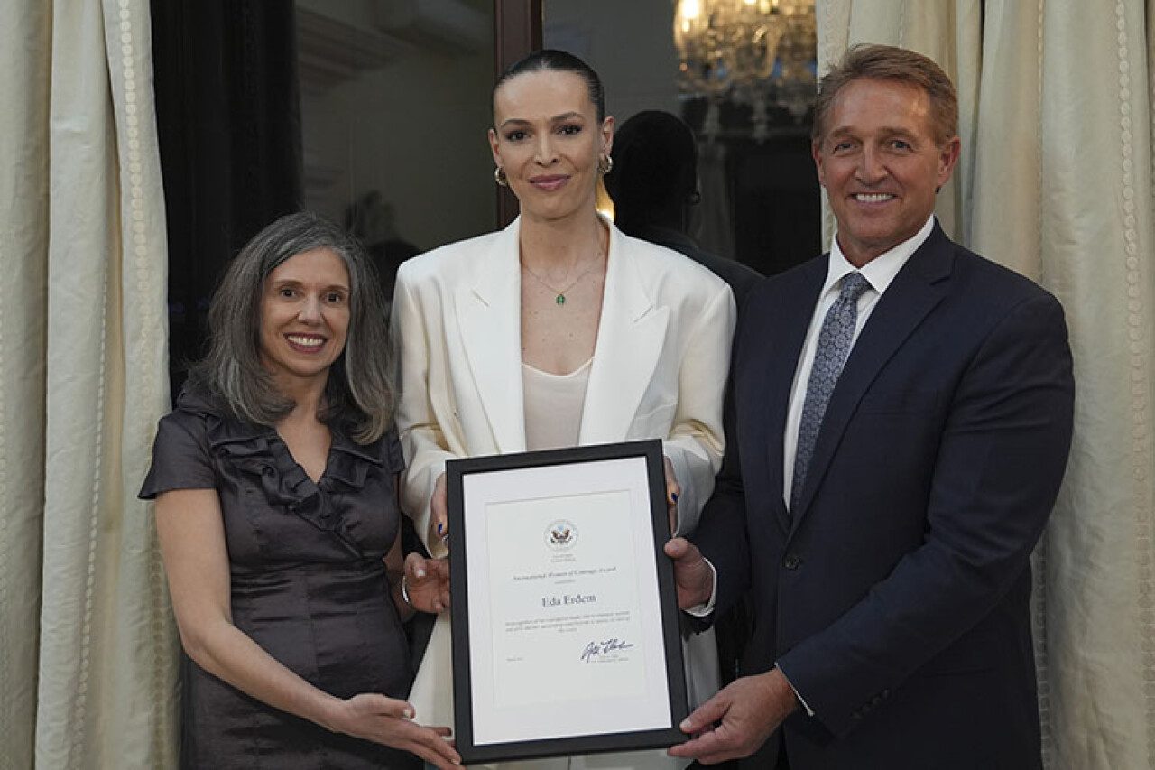Eda Erdem Dündar'a ödüle aday gösterildiği için bir plaket takdim edilirken, Jeffry L. Flake, kadınların güçlendirilmesi konusunda Eda Erdem Dündar'ın çok önemli bir figür olduğunu söyledi.