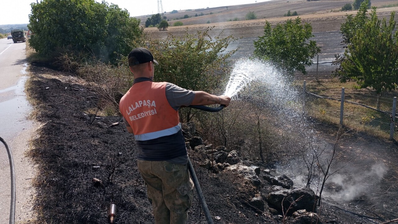​ Edirne'nin Lalapaşa ilçesinde yol kenarındaki tarlada başlayıp meyve bahçesine sıçrayan anız yangını söndürüldü.