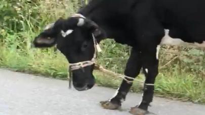 Giresun'da ineklere eziyet veren uygulama: Ayakları başlarına kelepçelenmiş inekler!