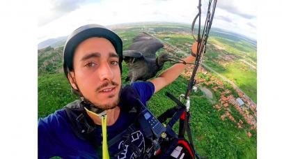 Bir akbaba, 100 fit yükseklikte yamaç paraşütçüsünün üzerine konuyor.