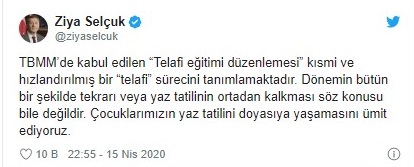 Bakan Selçuk, TBMM'de kabul edilen telafi eğitim düzenlemesiyle ilgili Twitter hesabından açıklamada, yaz tatilinin ortadan kalkması gibi bir durumun söz konusu olmadığını ifade etti.Bakan Selçuk, Twitter hesabından yaptığı açıklamada şu ifadeleri kullandı:"TBMM'de kabul edilen "Telafi eğitimi düzenlemesi" kısmi ve hızlandırılmış bir "telafi" sürecini tanımlamaktadır. Dönemin bütün bir şekilde tekrarı veya yaz tatilinin ortadan kalkması söz konusu bile değildir. Çocuklarımızın yaz tatilini doyasıya yaşamasını ümit ediyoruz"