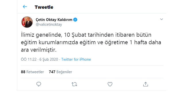 Vali Çetin Oktay Kaldırım, Twitter hesabından yaptığı açıklamada, 10 Şubat'tan itibaren bütün eğitim kurumlarında eğitim öğretime bir hafta daha ara verildiğini duyurdu.