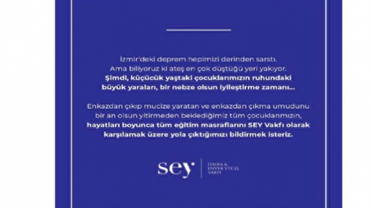 Vakıf, enkazdan çıkan ve çıkmasını beklenen bütün çocuklar için yaptığı açıklamayı sosyal medya hesaplarından, “İzmir’deki deprem hepimizi derinden sarstı. Ama biliyoruz ki ateş en çok düştüğü yeri yakıyor. Şimdi, küçücük yaştaki çocuklarımızın ruhundaki büyük yaraları, bir nebze olsun iyileştirme zamanı... Enkazdan çıkıp mucize yaratan ve enkazdan çıkma umudunu bir an olsun yitirmeden beklediğimiz tüm çocuklarımızın, hayatları boyunca tüm eğitim masraflarını SEY Vakfı olarak karşılamak üzere yola çıktığımızı bildirmek isteriz” sözleriyle duyurdu.