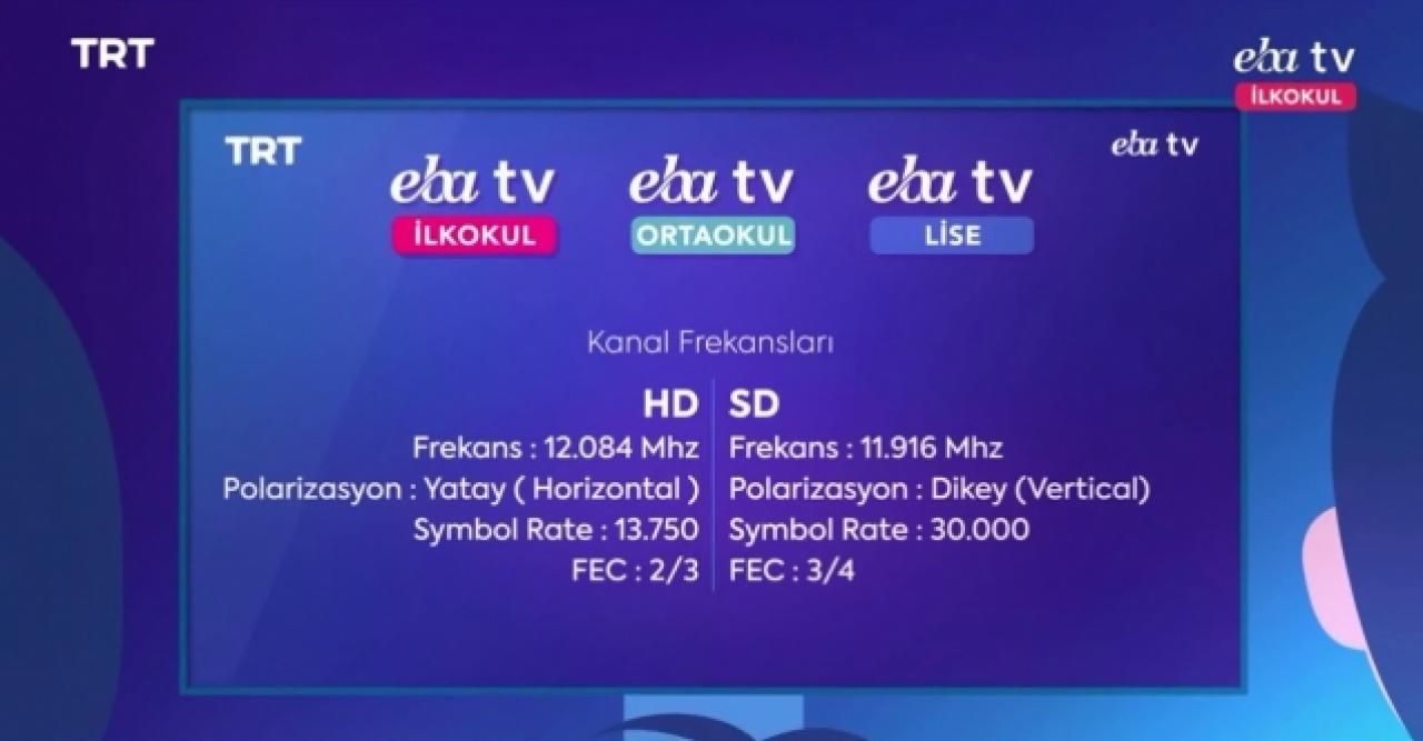 HD (yüksek çözünürlüklü) EBA TV İlkokul HD, EBA TV Ortaokul HD, EBA TV Lise HD kanalları TURKSAT uydusu üzerinden 12084 MHz, Horizontal (Yatay), Sembol Oranı:13750 FEC:2/3 parametreleri ile yayınlanmaktadır. TKGS sistemine sahip olan uydu alıcılarda ya da uydu alıcılı TV’lerde EBA TV İlkokul HD 86. kanaldan, EBA TV Ortaokul HD 87. kanaldan, EBA TV Lise HD 88. kanaldan izlenebilir.