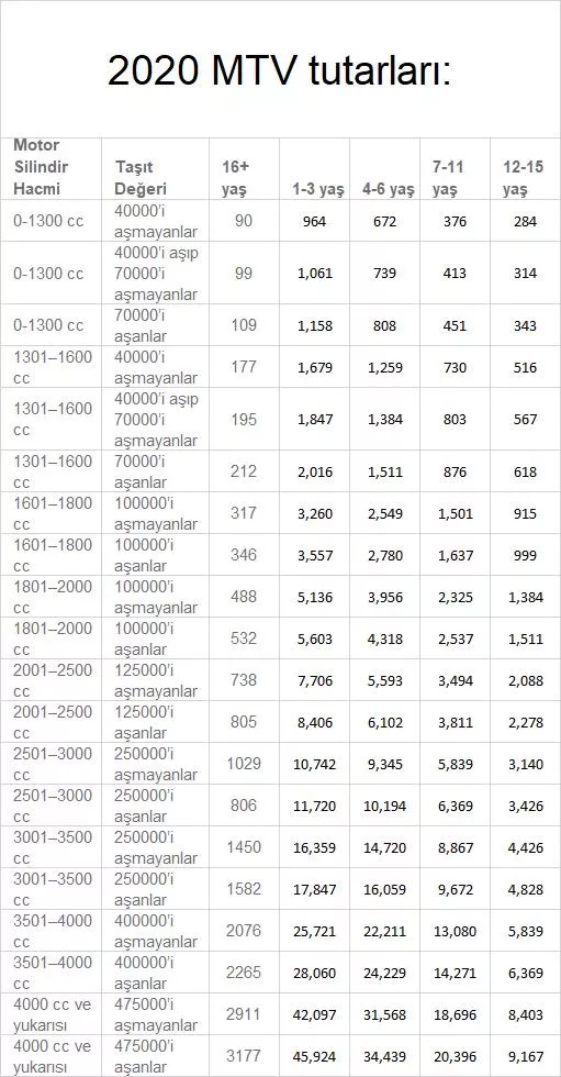 1-3 yaş, 4-6 yaş, 7-11 yaş, 12-15 yaş ve 16 yaş üstü motor hacmi 1.3 altı, 1.6, 2000 motor gibi tüm araçlar için ödenecek MTV yüzde 12 olacak. 2020 yılında MTV için ödenecek ücret belli oldu.