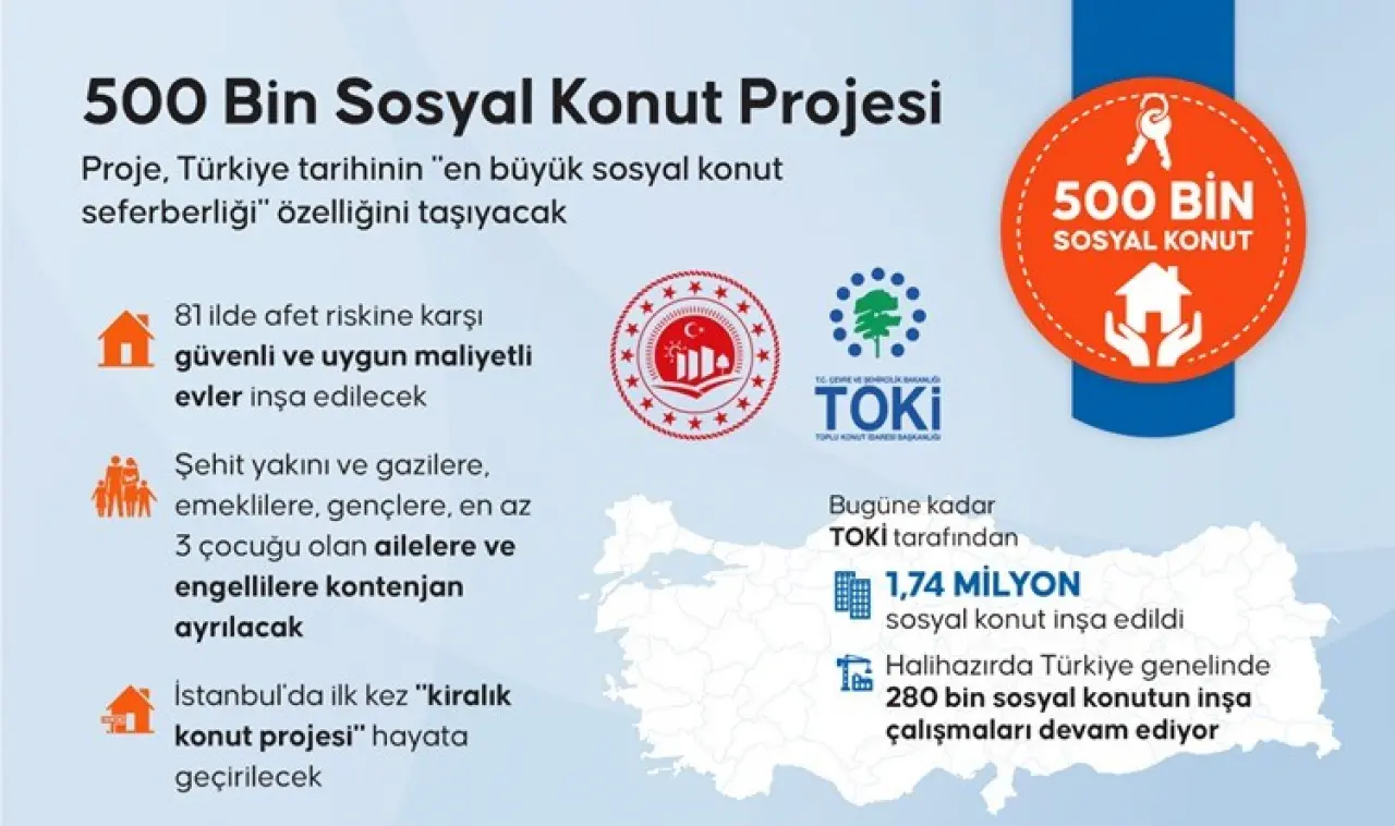 Cumhurbaşkanı Recep Tayyip Erdoğan tarafından açıklanan “Yüzyılın Konut Projesi” ile Türkiye genelinde 81 ili kapsayan büyük bir sosyal konut seferberliği başlatıldı. Çevre, Şehircilik ve İklim Değişikliği Bakanlığı koordinasyonunda, TOKİ eliyle hayata geçirilecek proje kapsamında toplam 500 bin sosyal konut, 500 mahalle konağı, 500 cami, 500 anaokulu, 500 aile sağlığı merkezi ve çeşitli sosyal tesisler inşa edilecek.