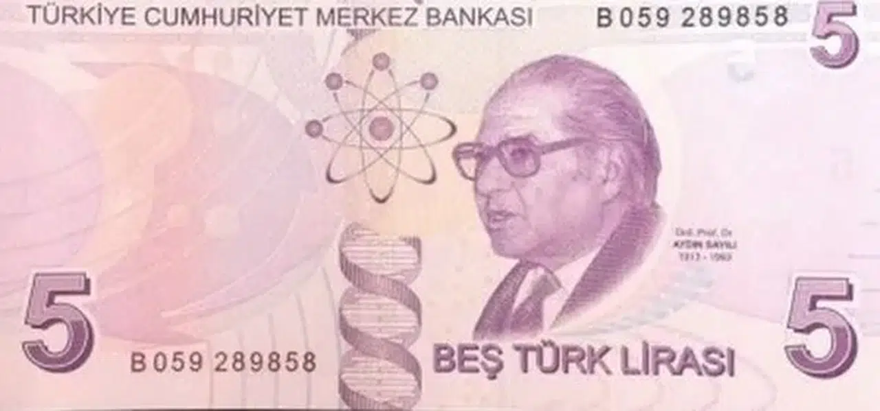 Türkiye Cumhuriyet Merkez Bankası (TCMB), banknotların arka yüzünde Türk kültürüne, sanatına ve bilimine katkı sağlamış önemli isimlere yer veriyor. 5 TL’nin arkasında yer alan isim ise bilim tarihçisi Ord. Prof. Dr. Aydın Sayılı.