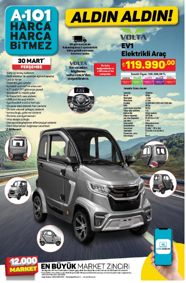 Elektrikli araç 119 bin 990 TL'den satılacak. Kredi kartına 9 taksit yapılacak. Teslimatla ilgili katalogda, '30 gün içerisinde bulunduğunuz il içerisindeki Volta yetkili servisine ücretsiz teslim' açıklaması yer aldı.