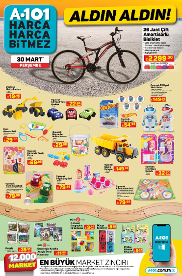 A101'de 30 Mart itibarıyla gıda, elektronik ev eşyaları, oyuncak, tekstil gibi birçok kategoriden uygun fiyatlı ürünler müşterilerin beğenisine sunulacak. A101'de elektrikli araç 119 bin 990 TL olacak. İşte A101 30 Mart indirimli ürünler kataloğu...