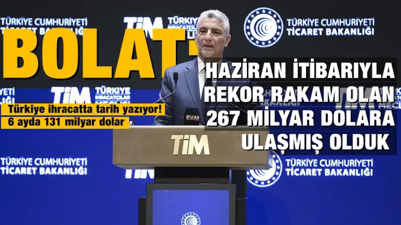 Bolat, son 25 ayın 14'ünde aylık rekor kırdıklarını, 18'inde artış sağladıklarını kaydederek, "Haziran itibarıyla yıllık ihracatımızda rekor rakam olan 267 milyar dolara ulaşmış olduk. Yüzde 3,2 artış demek. 1 Ocak'ta 261,8 milyar dolardan devraldık 5,2 milyar dolar artırarak 267 milyar dolara hep birlikte sizlerle ulaştırmış olduk." diye konuştu.