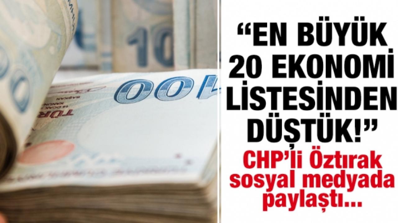 CHP Sözcüsü Faik Öztrak, sosyal medya hesabından "Dünyanın en büyük 20 ekonomisi"nin listesini paylaştı. Öztrak, aynı listenin 1990 yılındaki halini de paylaşarak, Türkiye'nin ekonomisinde yaşanan gerilemeyi gözler önüne serdi.