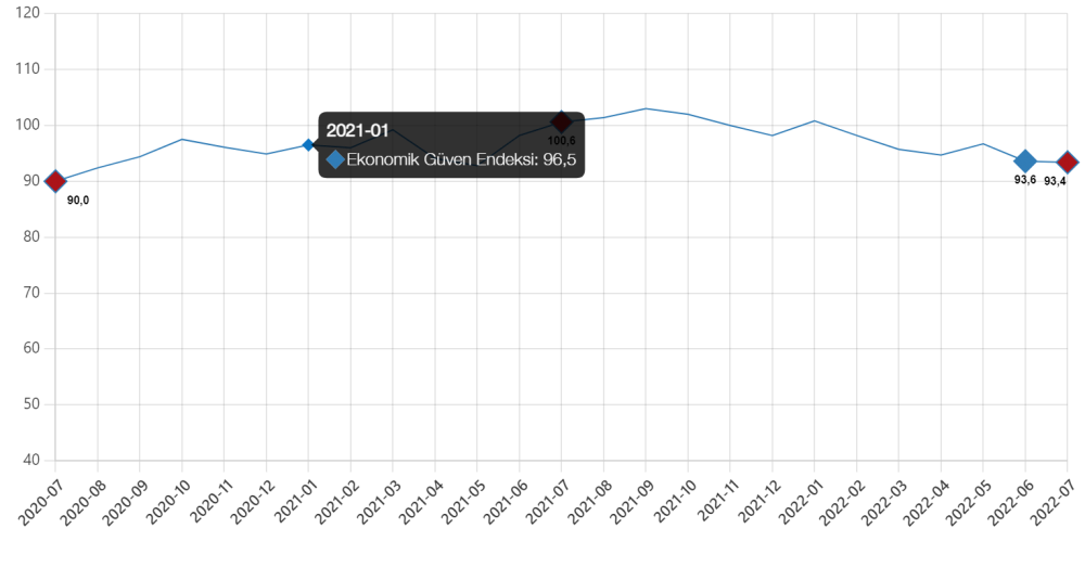 Ekonomik güven endeksi, güven endeksleri ve değişim oranları, Temmuz 2022
